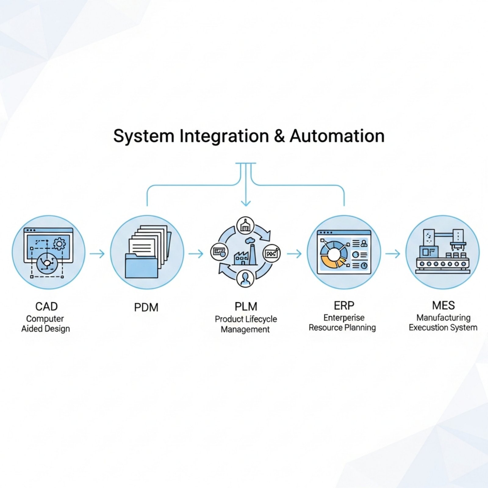 CAD → PDM → PLM → ERP → MES. We connect the dots so your data flows seamlessly across your ecosystem — reducing manual work and eliminating costly inconsistencies.